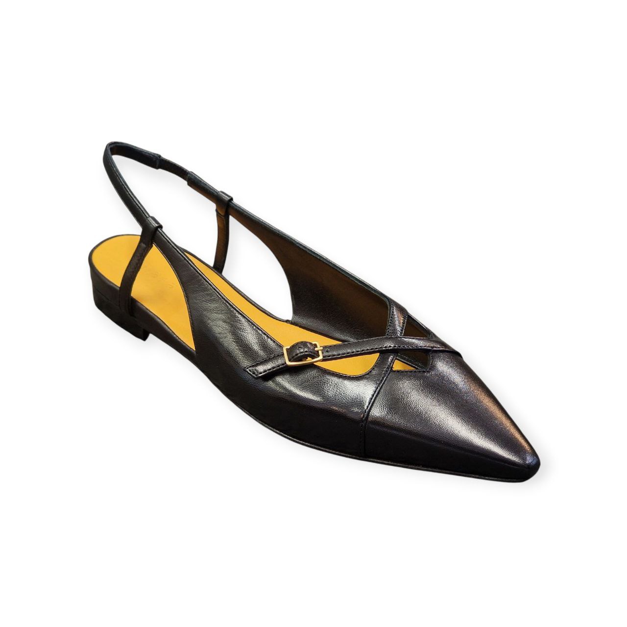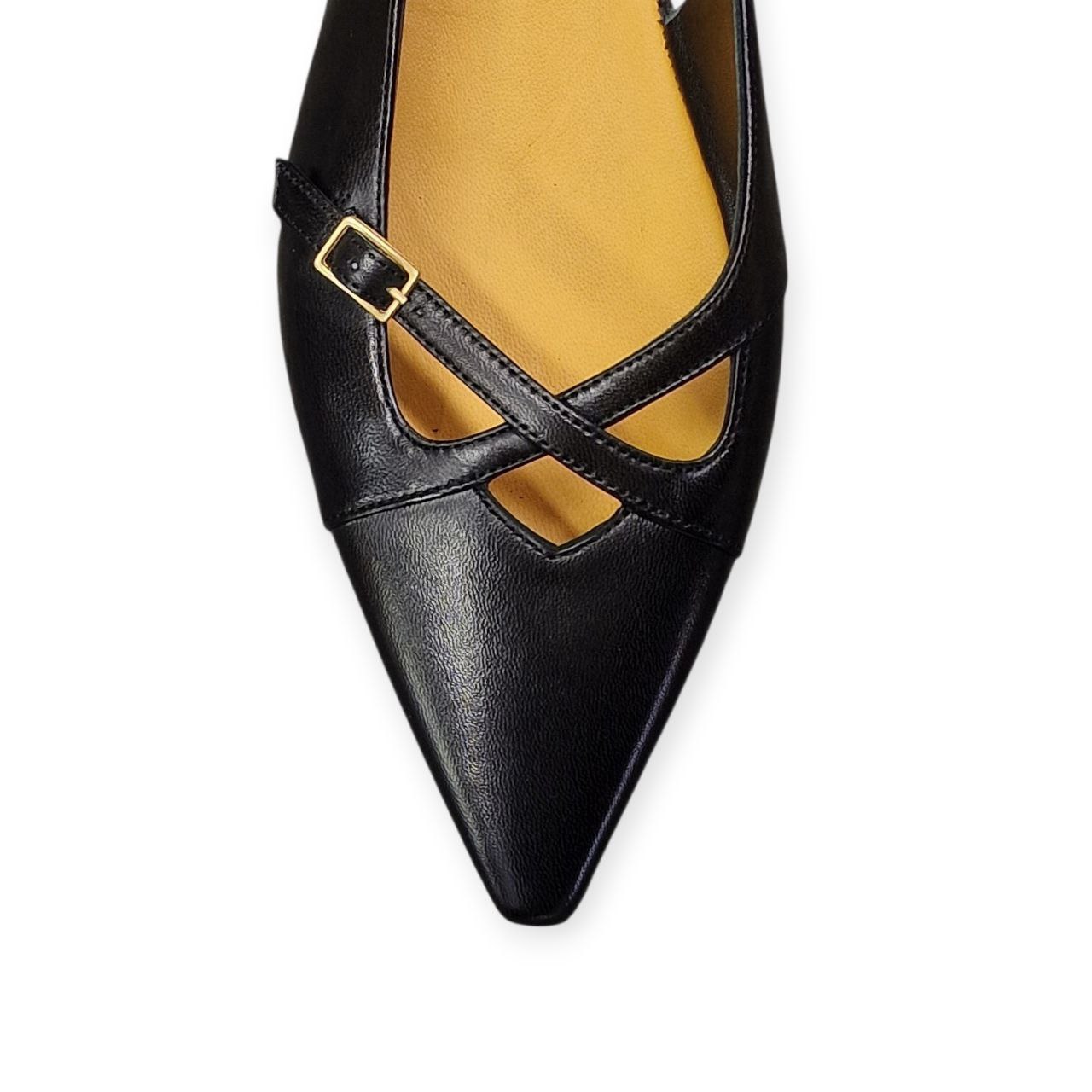 Le ballerine Milena di Mara Bini sono pensate per chi cerca eleganza e comfort in un solo prodotto. Realizzate in pregiata nappa di vitello colore nero, presentano un raffinato incrocio superiore e fibbie dorate che le rendono uniche nel loro genere.