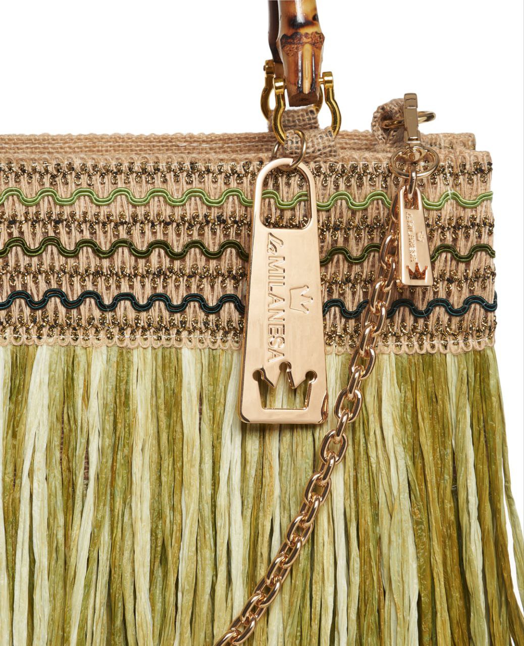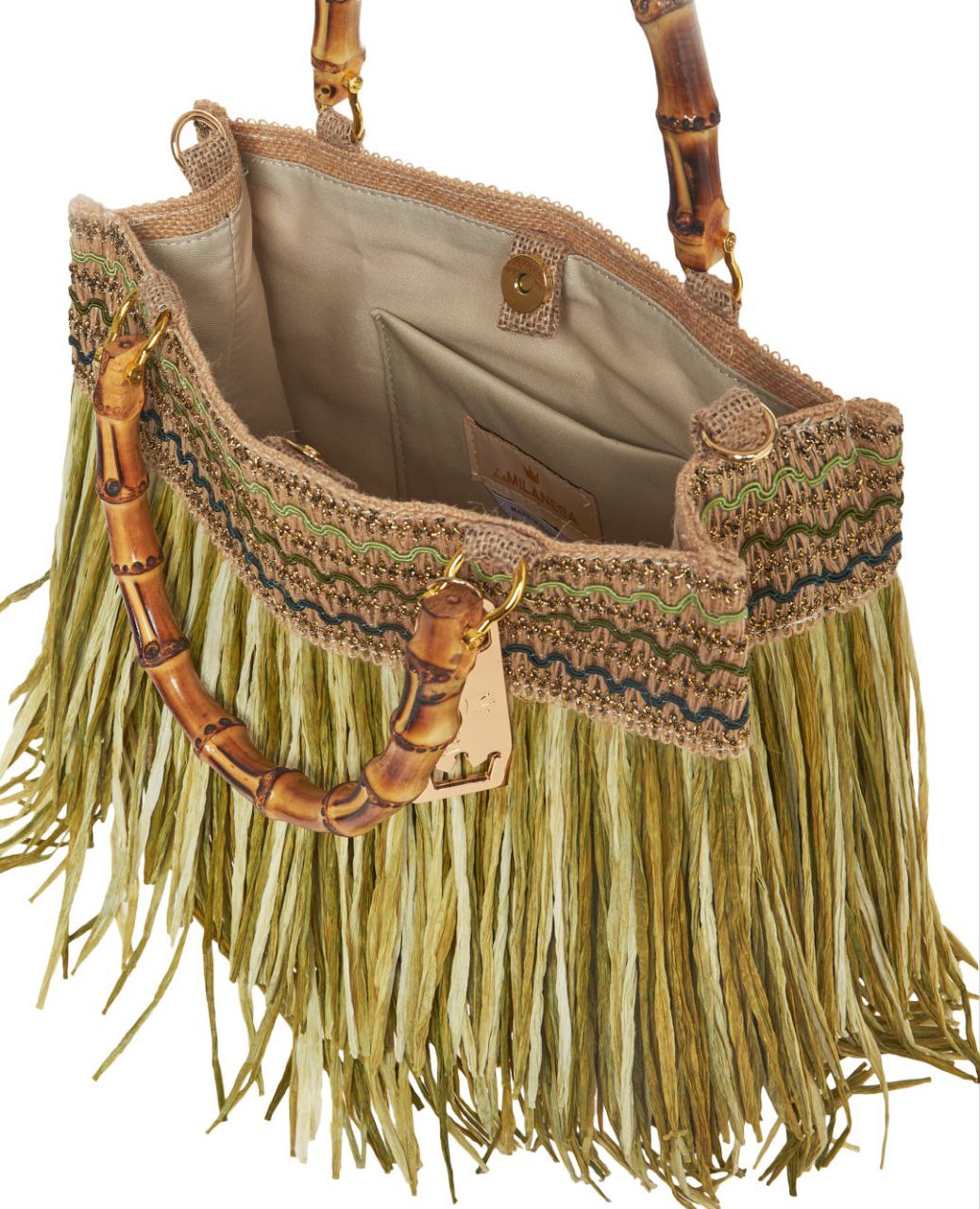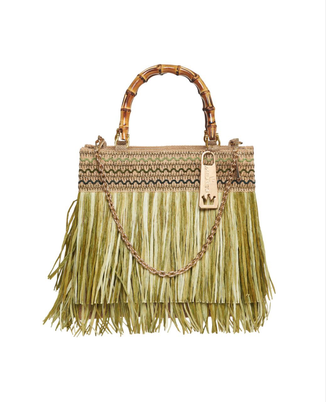Borsa a mano con frange dal carattere deciso e raffinato. La combinazione tra texture materiche, manico in bamboo naturale e catena dorata crea un equilibrio armonioso tra stile boho e dettagli eleganti.