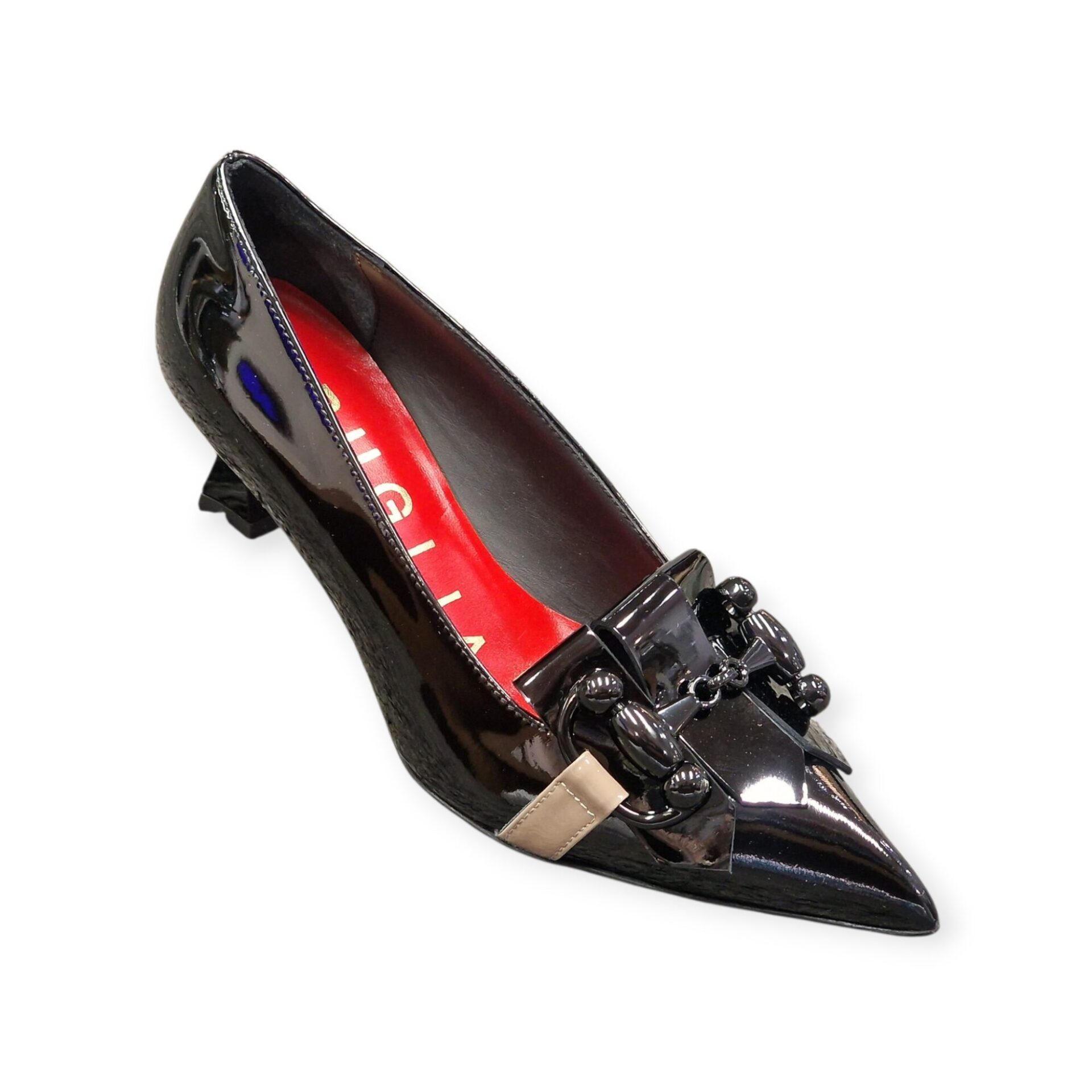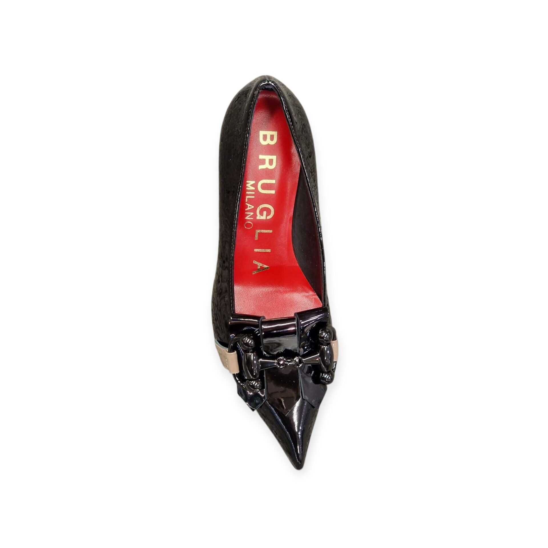 Décolleté Bruglia sapientemente realizzate in pregiata pelle verniciata nera. La silhouette elegante è accentuata da un audace fiocco decorativo e da un esclusivo dettaglio a catena, che aggiungono un tocco di raffinatezza. L’interno presenta una vivace fodera rossa, che garantisce comfort e stile. Perfette sia per le occasioni professionali che per quelle formali, queste décolleté sono un’aggiunta indispensabile a qualsiasi guardaroba.