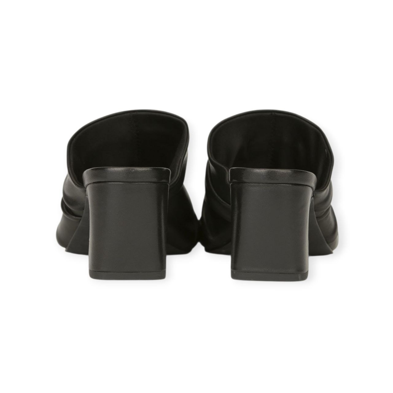 I mules Ash Eva si distinguono per il design a punta squadrata e l’elegante tomaia in morbida nappa nera con un caratteristico effetto drappeggiato. Presentano un tacco a blocchetto di circa 7 cm e una suola in gomma che assicura comfort e stabilità per tutto il giorno.