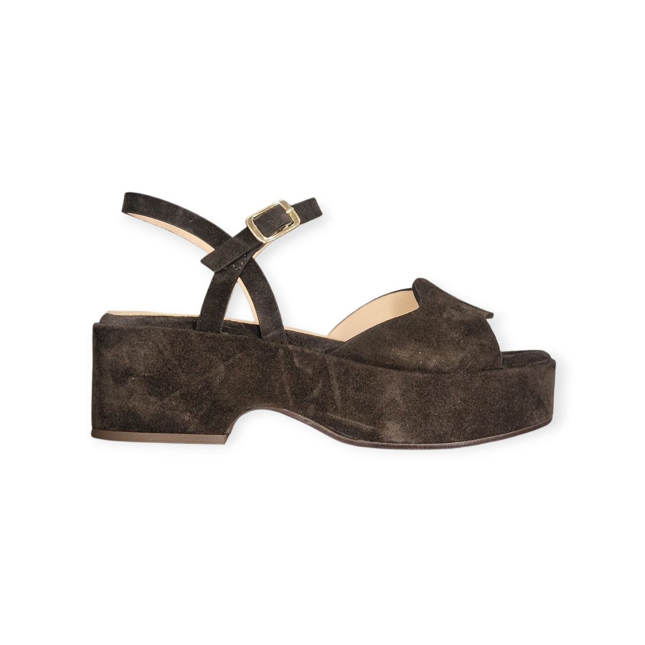 Questi sandali con plateau Duccio del Duca si distinguono per un’estetica che fonde eleganza moderna e un tocco rétro, tipica del brand. Presentano una tomaia in pregiato camoscio di colore testa di moro, con un cinturino sottile regolabile alla caviglia e fibbia metallica dorata. Il plateau è di 4 cm.