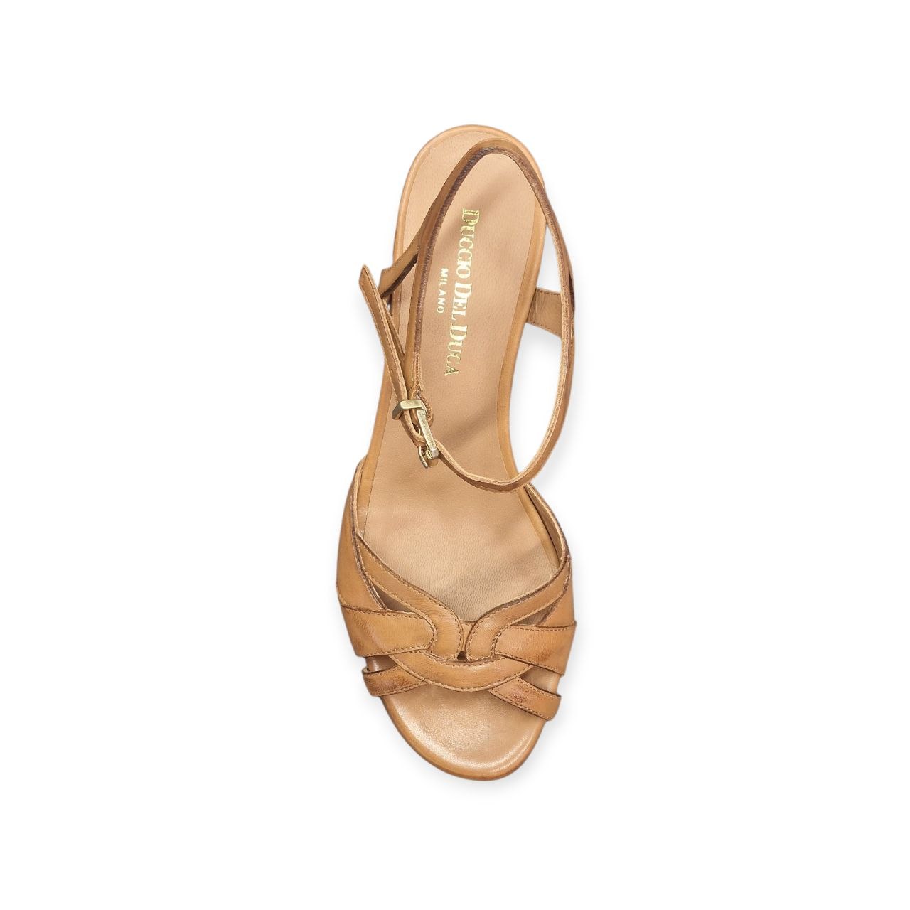 Sandali Duccio del Duca in pelle color cuoio, che incarnano lo stile artigianale e senza tempo del brand. Questo modello si distingue per una linea pulita con tacco basso e solido (50 mm), ideale per chi cerca eleganza senza rinunciare al comfort. La tomaia è realizzata in pregiato vitello color cuoio, spesso con dettagli di cinghie incrociate o intrecciate e fibbia dorata.