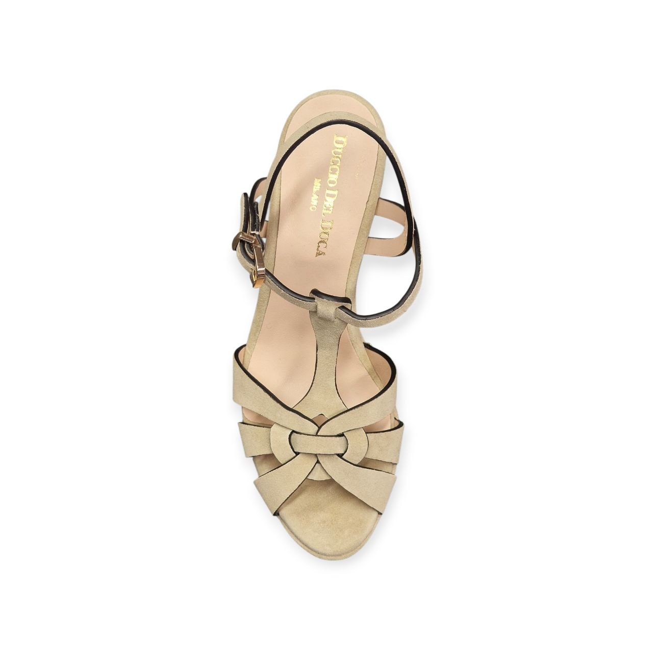 Sandali Duccio del Duca con plateau in camoscio beige, un classico del brand. Questo è lo “zatterone” per eccellenza della collezione. Presenta una tomaia in pelle scamosciata con fasce intrecciate sul davanti e un cinturino alla caviglia. Ha un tacco da 10 cm e un plateau di 3 cm che bilancia perfettamente l’altezza.