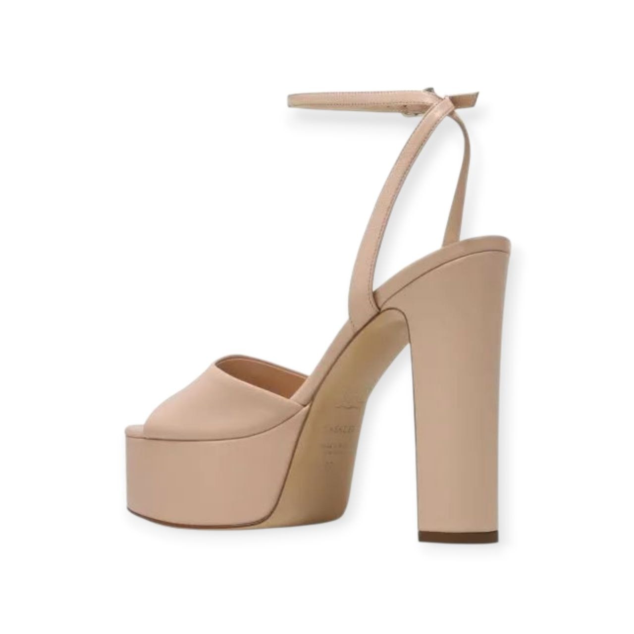 Per le amanti delle altezze, Casadei presenta il plateau Patty in morbida pelle minorca cipria. Rievocativo degli anni ’70, il plateau affronta la tematica del «bello e camminabile» con stile e grinta. Il tacco grosso di 14 cm, perfettamente bilanciato dal plateau da 5 cm, slancia la figura assicurando al tempo stesso stabilità e comfort. A completare il design, l’inconfondibile fibbia C-Chain che rende questo modello davvero unico. Ideale per serate estive e party esclusivi, dona altezza e sicurezza a chi vuole farsi notare con un tocco di glamour retrò.