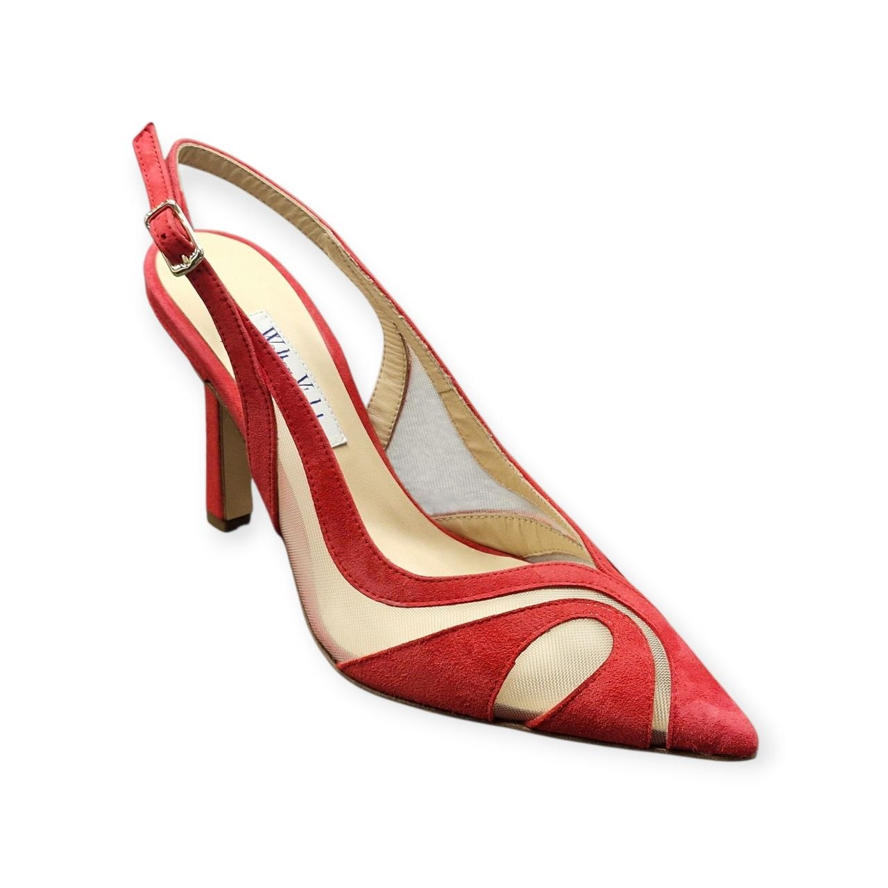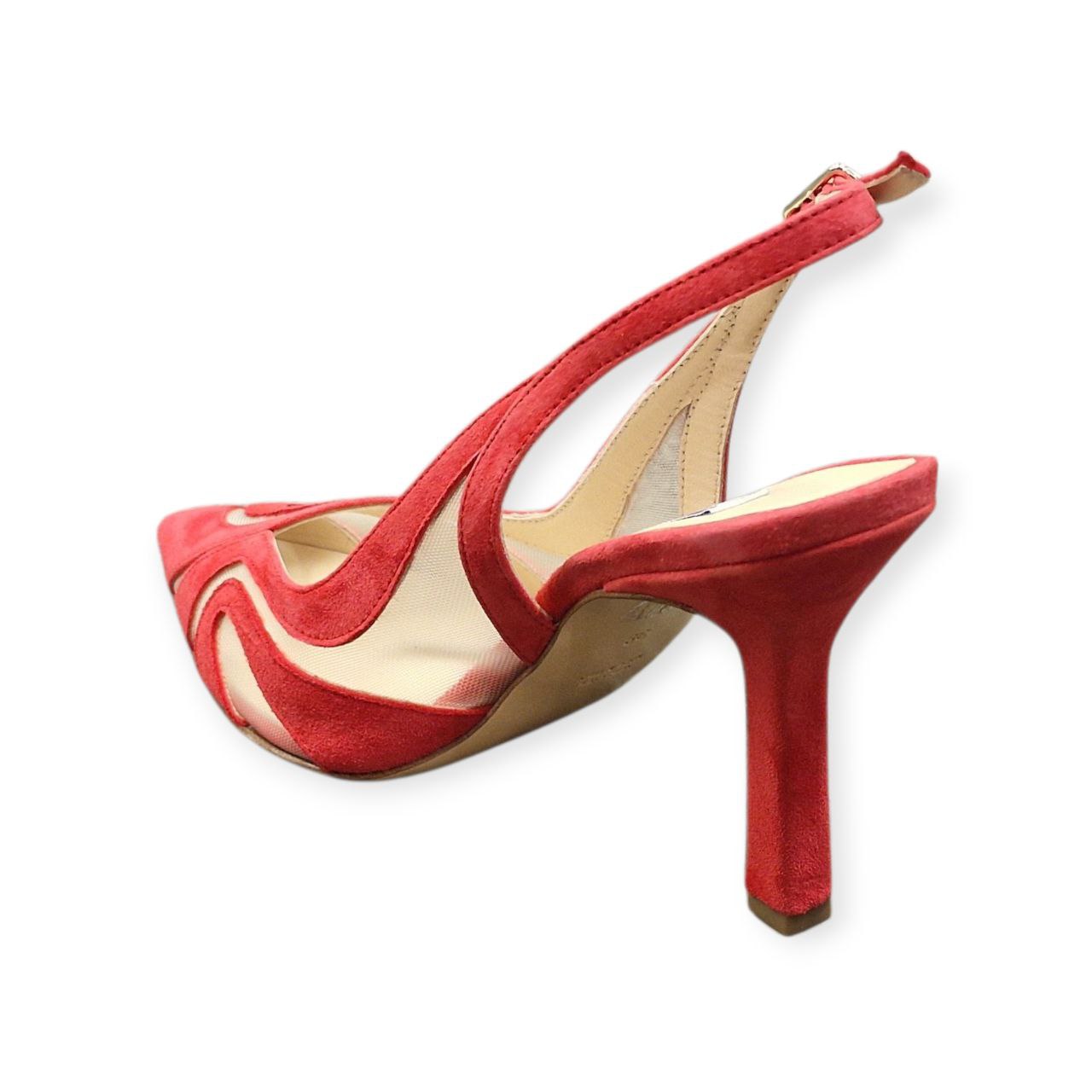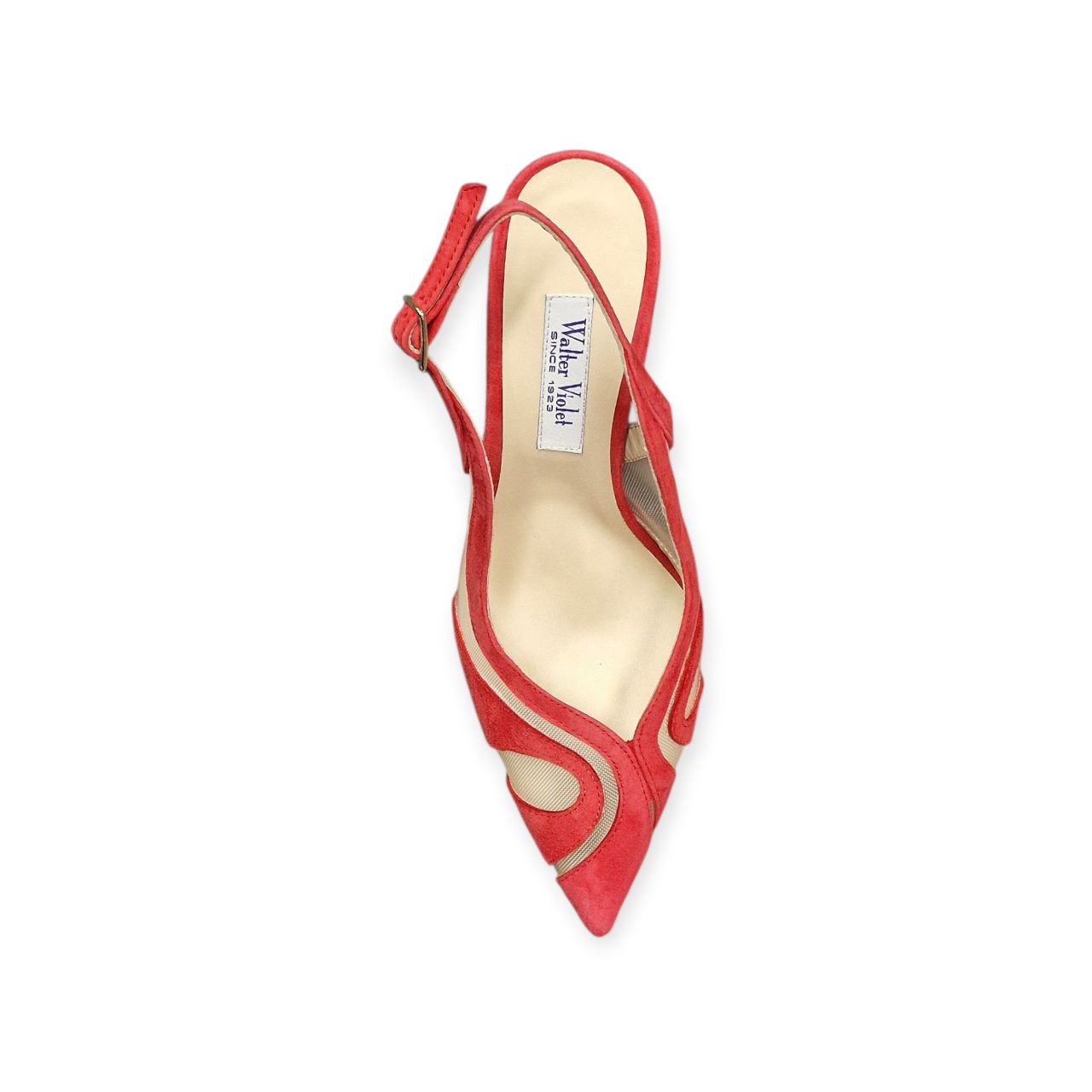 Slingback Walter Violet a punta in colore rosso, dal design sofisticato e femminile. Il tacco da 90 mm dona slancio ed eleganza, mentre le onde di microrete e camoscio aggiunge un tocco distintivo e chic. Perfetta per occasioni speciali o per arricchire i tuoi look quotidiani con un dettaglio raffinato.